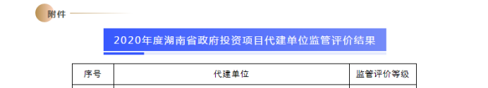 按照《湖南省政府投资项目代建单位监管评价办法(试行)》规定,省、市(州)、县(市、区)发展改革部门对全省代建项目及其代建单位投标行为进行监管评价。我校设计院荣获2020年度湖南省政府投资项目代建单位监管评价A级,这是对设计院严格按照代建合同约定履行代建职责及执行工作流程的高度肯定。