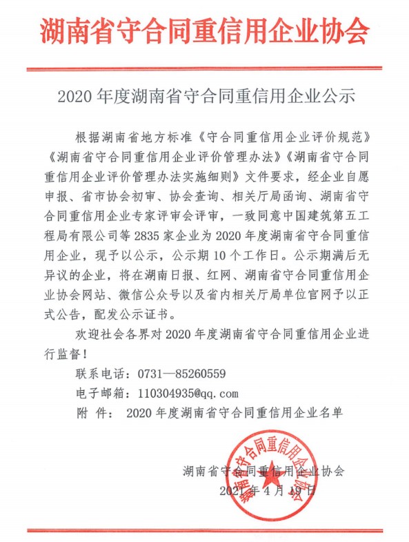 经湖南省守合同重信用企业协会评审,开云在线开户设计研究院有限公司荣获2020年度湖南省“守合同重信用企业”称号,这是设计院连续第三年获得此项荣誉。