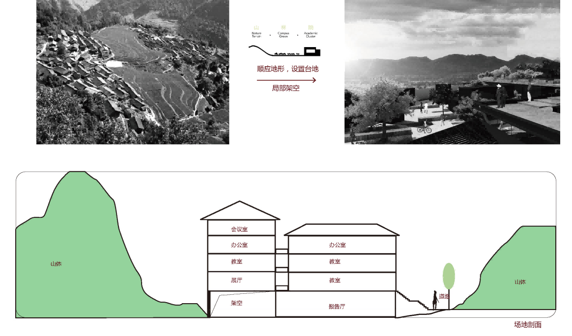 基于山地现状和净用地范围的狭长,我们的设计将现状原有的山间小路拓宽加长,与西北侧的游客中心服务广场相连。建筑沿着道路两侧布置,顺应地形,设置台地,或者局部架空。大致分为三个区域:运动场地、教学办公区、生活服务区。通过道路将三个片区联系起来,形成一个整体。展现党政教育与革命老区小城复兴的复合型党性教育基地。