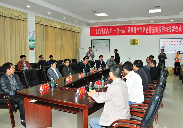 (本网讯)4月17日下午,我校与桃江市自来水公司“一院一品”暨共建产学研合作基地签约及挂牌仪式在桃江县住房与城乡建设局会议室举行。校长李建华、副校长刘辉煌,桃江县县长何军田、副县长刘武、县住房与城乡建设局、桃江县自来水公司、我校市政与测绘工程学院以及学校相关职能部门负责人出席了签约仪式。