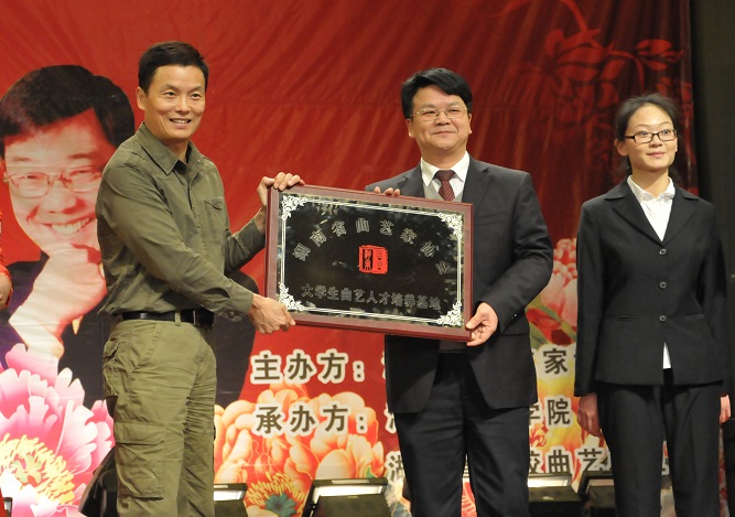 周卫星在湖南省曲艺家协会向开云在线开户授予“大学生曲艺人才培养基地”的仪式上说:“我们希望能发现优秀曲艺人才,认真合作,着力培养,为发展湖南曲艺事业,弘扬优秀传统文化做出贡献。”汤放华和学生代表马丹丹等代表学校接受牌匾,我校由此开始成为了省曲协的人才培养基地。