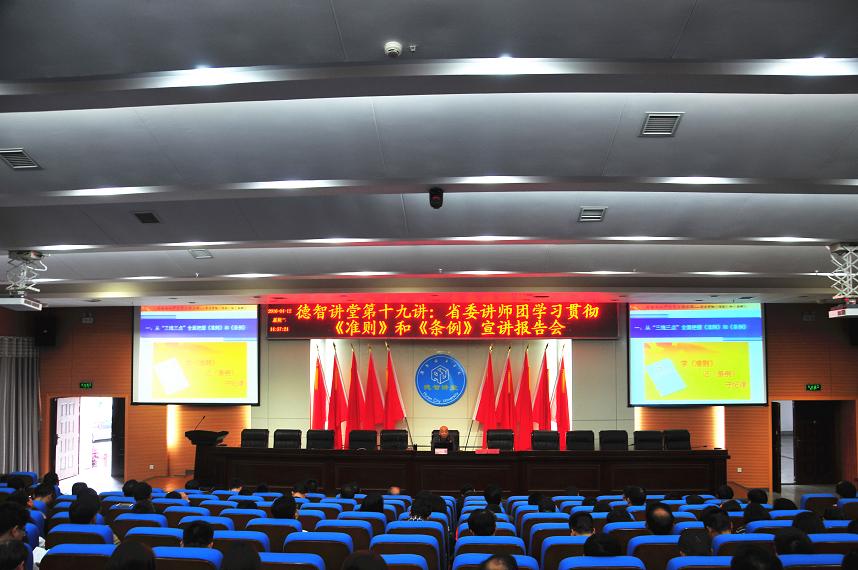 (本网讯)4月12日下午,学校在逸夫图书馆报告厅举行德智讲堂第十九讲,特邀湖南省委讲师团科研处处长柳行教授作了题为《为全面从严治党立德立规》的专题报告,就学习贯彻《中国共产党廉洁自律准则》和《中国共产党纪律处分条例》进行宣讲。在家的校领导,全校副科级以上干部,党总支、直属支部委员,机关党总支全体党员等200余人参加了报告会。报告会由党委书记罗成翼教授主持。