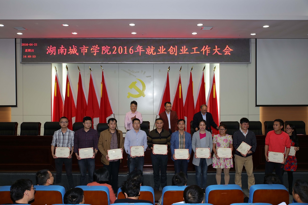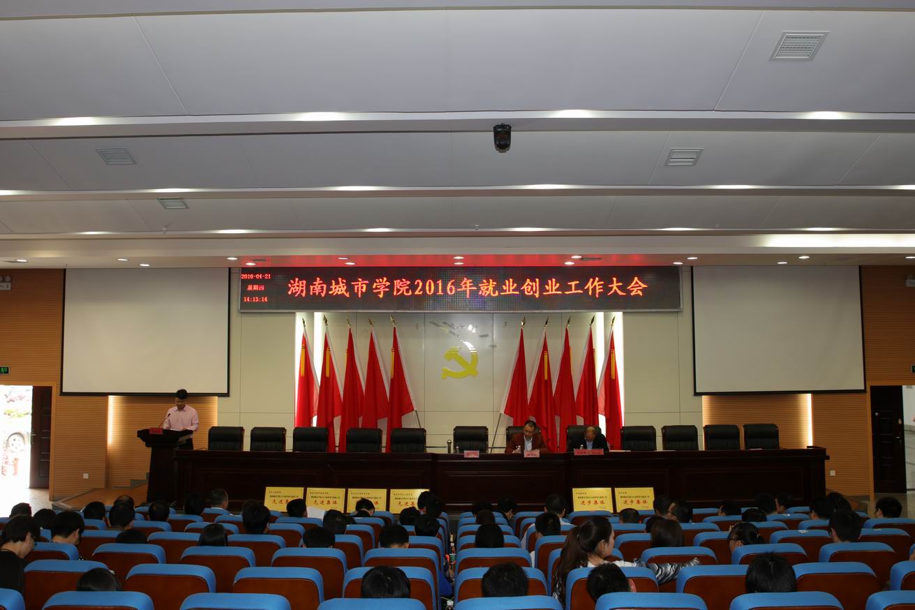 (本网讯)4月21日下午,我校2016年就业创业工作大会在图书馆报告厅举行。校长李建奇,党委副书记、副校长孟昭武,副校长汤放华,就业创业工作领导小组成员,二级学院党政主要负责人、分管学生工作领导,学院团总支书记、就业创业专干,获奖教师和学生代表,以及团委、学生处、招生就业处全体工作人员参加了会议。
