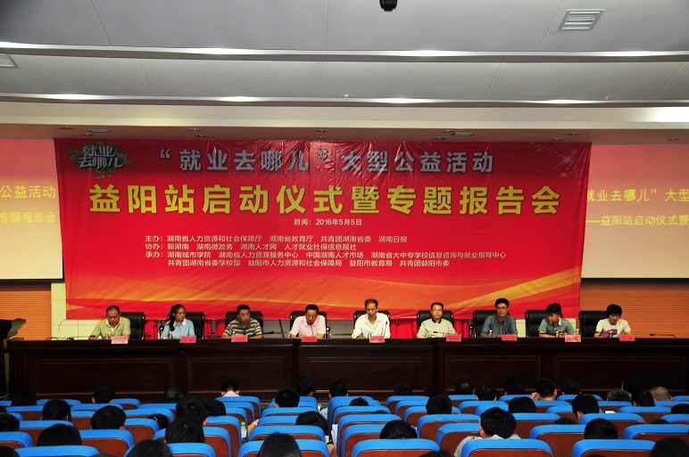 (本网讯)5月5日下午,湖南省“就业去哪儿”大型公益活动益阳站启动仪式在我校隆重举行。省人力资源和社会保障厅巡视员曾坤、省大中专学校学生信息咨询与就业指导中心副主任夏学军、益阳市人民政府副厅级干部喻国良出席会议,校长李建奇、副校长汤放华以及各二级学院学生代表300余人参加启动仪式。仪式由市委组织部副部长、市人力资源和社会保障局党组书记、局长肖立平主持。