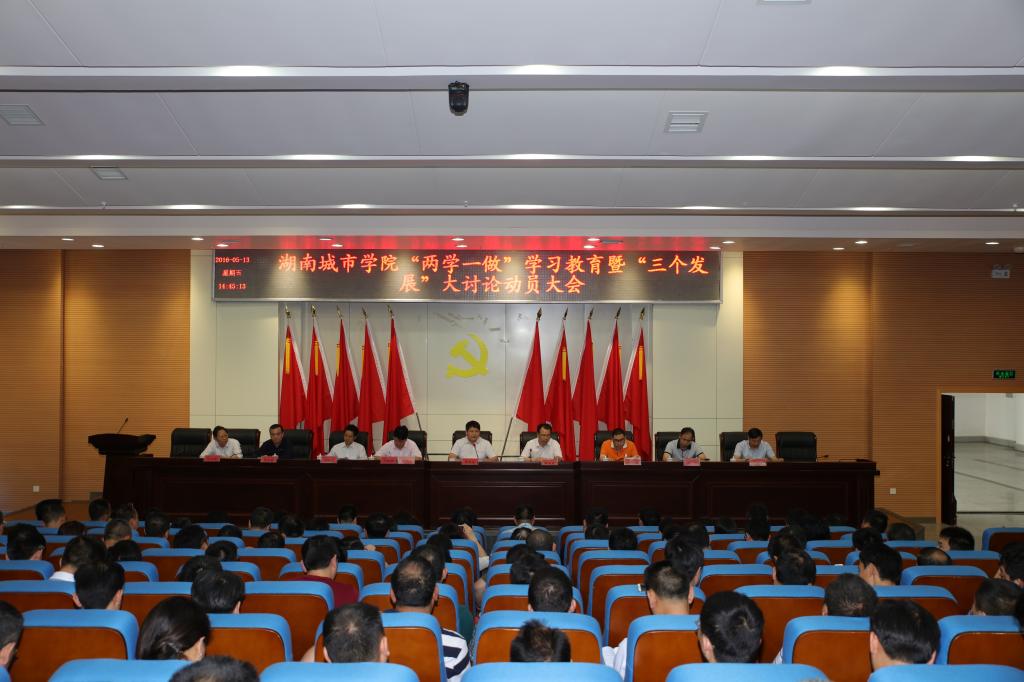 (本网讯)5月13日下午,学校在图书馆报告厅举行了“两学一做”暨“三个发展”大讨论动员大会。党委书记罗成翼、校长李建奇分别就“两学一做”学习教育活动和学校“三个发展”大讨论作动员。全体在校校领导,副科以上干部、教工党支部书记、学生党支部书记参加会议。副校长汤放华主持会议。