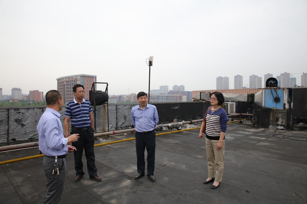 谭献良一行先后来到西南面环校路、学生公寓外围、垃圾站、一食堂屋面以及饮用水房等区域进行巡查。