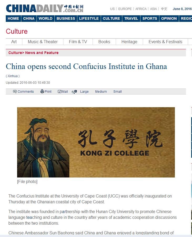 (本网讯) 加纳当地时间6月2日上午,我校与加纳海岸角大学合作创办的孔子学院正式揭幕。这也是我省二本高校首次在国外设立孔子学院,受到了中央、省内媒体以及加纳当地媒体的广泛关注。
