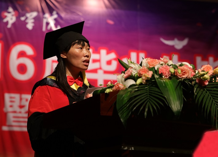 毕业生代表通信与电子工程学院郭鸣坤、肄业班学生代表文学与新闻传播学院高妍、教师代表市政与测绘工程学院鄢恒珍博士、学生家长代表土木工程学院毕业生家长何文胜分别上台发言,表达了对学校的感恩之情,对毕业生的美好祝愿。