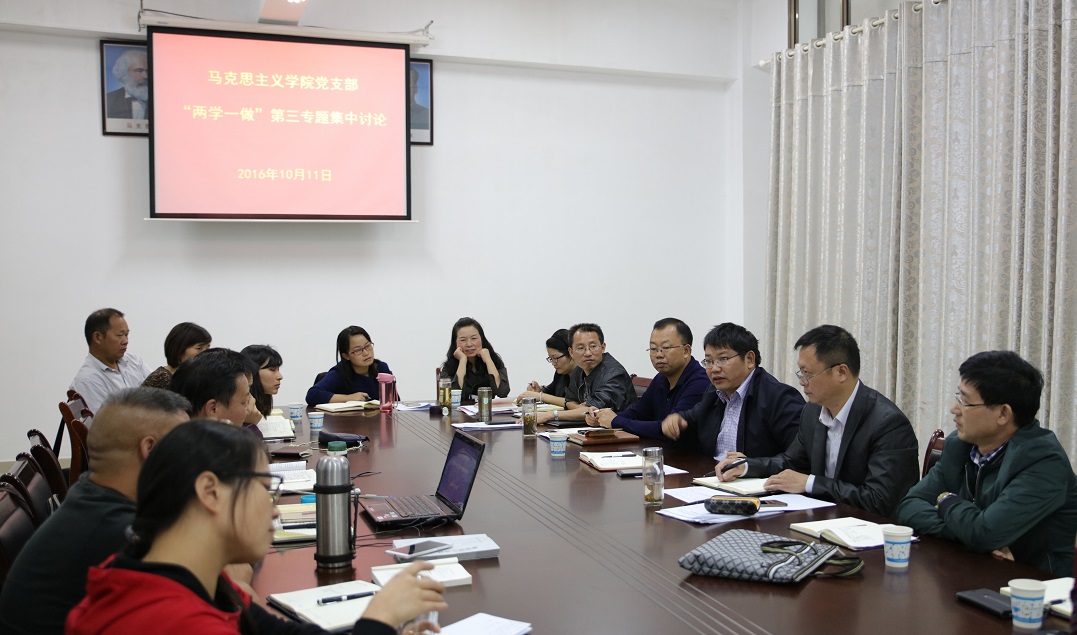 (本网讯)10月11日下午,马克思主义学院党支部在信息楼126会议室举行了“两学一做”第三专题“讲道德,有品行”专题学习研讨会。党委书记罗成翼以普通党员身份参加讨论,党委委员、组织部长罗新湘一同参加。马克思主义学院党支部全体党员参加研讨。