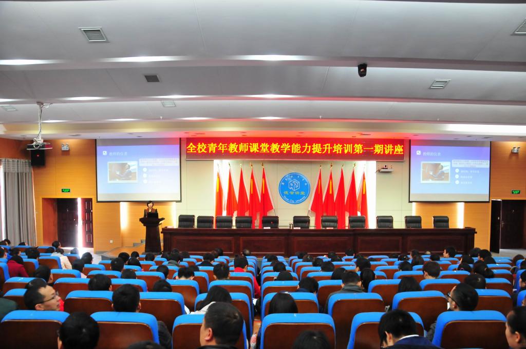 (本网讯)12月6日下午,我校在图书馆报告厅举办了全校青年教师课堂教学能力提升培训讲座。副校长郑卫民、雷存喜出席讲座并讲话,教务处、人事处负责人,各二级学院教学院长、督导团全体成员以及全校35周岁以下青年教师近300人一起聆听了讲座。讲座由教务处处长张伟主持。
