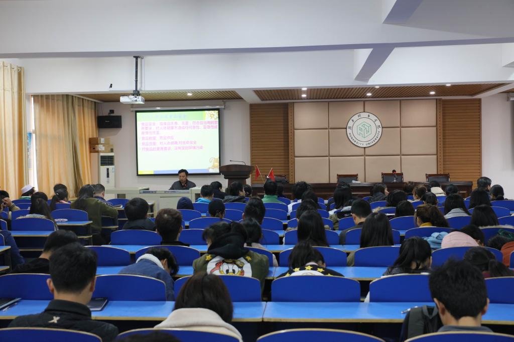 讲座中,熊剑波从什么是食品安全、食品安全消费误区、如何防范不安全食品、如何合理饮食等方面,认真详细地讲解了食品安全的重要性和不容忽视的问题,并向在场的大学生普及了食品安全、食物中毒应急处置等相关知识。(文/秦科 图/文彦波)
