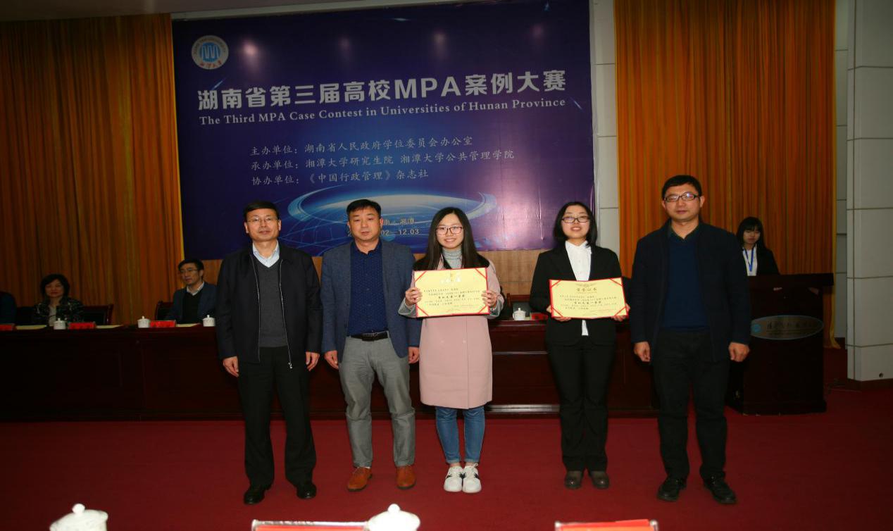 (本网讯)12月3日,由湖南省人民政府学位委员会办公室主办的湖南省第三届高校MPA 案例大赛颁奖大会在湘潭大学举行。由我校管理学院李双清博士指导,黄晶晶、黄茜、龙玲、伍栩娴等4位同学组成的代表队荣获此次大赛本科生组一等奖,李双清被评为大赛优秀指导教师。