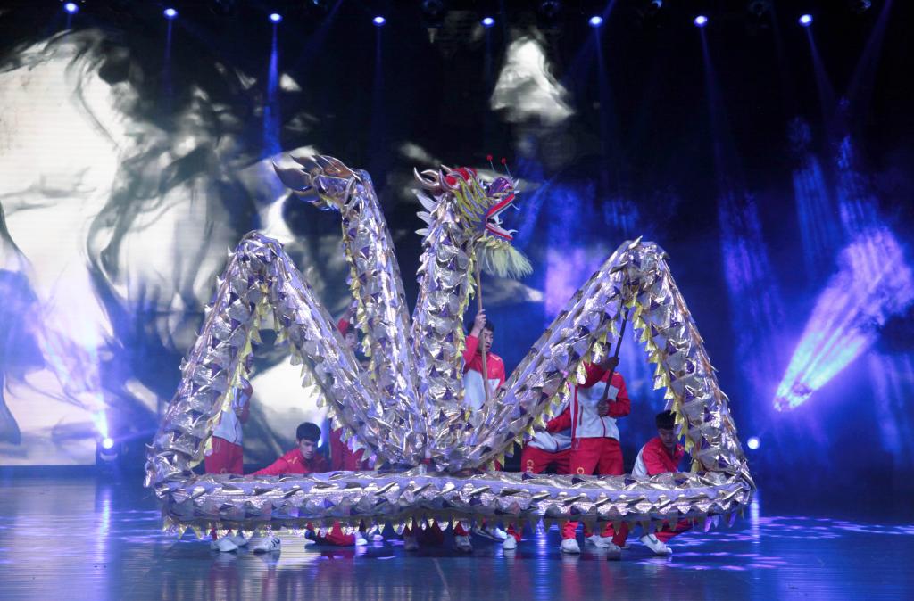 凤箫声动,玉壶光转,一夜鱼龙舞。随着台下灯光渐暗,金光灿灿的长龙活灵活现,气势磅礴,仿佛就要腾飞,体育学院带来的传统体育节目《舞龙》拉开晚会序幕。