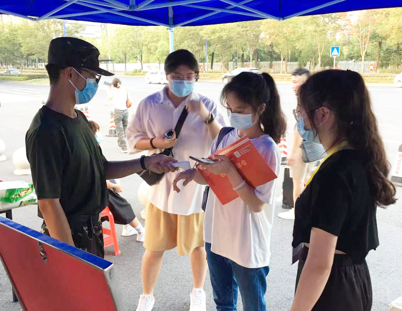 迎新点忙碌中的学生工作人员。