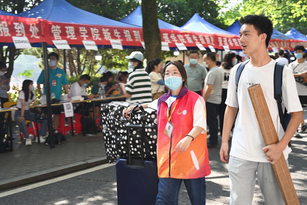 满载着新生和行李的电瓶车往复行驶在校门与迎新点之间。