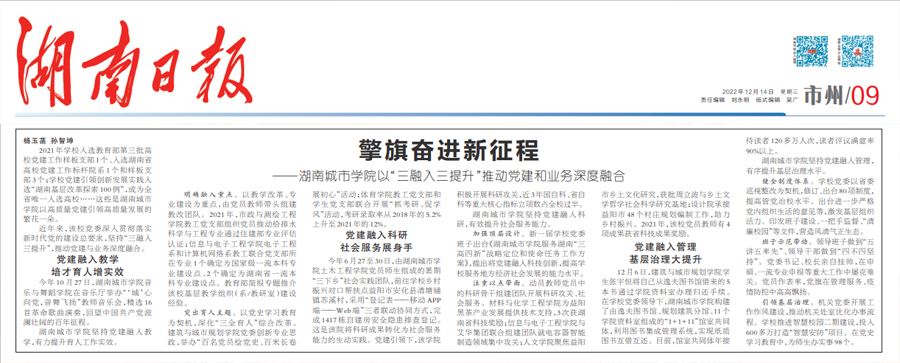 本网讯 12月14日,《湖南日报》09版以《擎旗奋进新征程——开云在线开户以“三融入三提升”推动党建和业务深度融合》为题,报道了我校党建引领学校改革发展取得的新成效。全文如下: