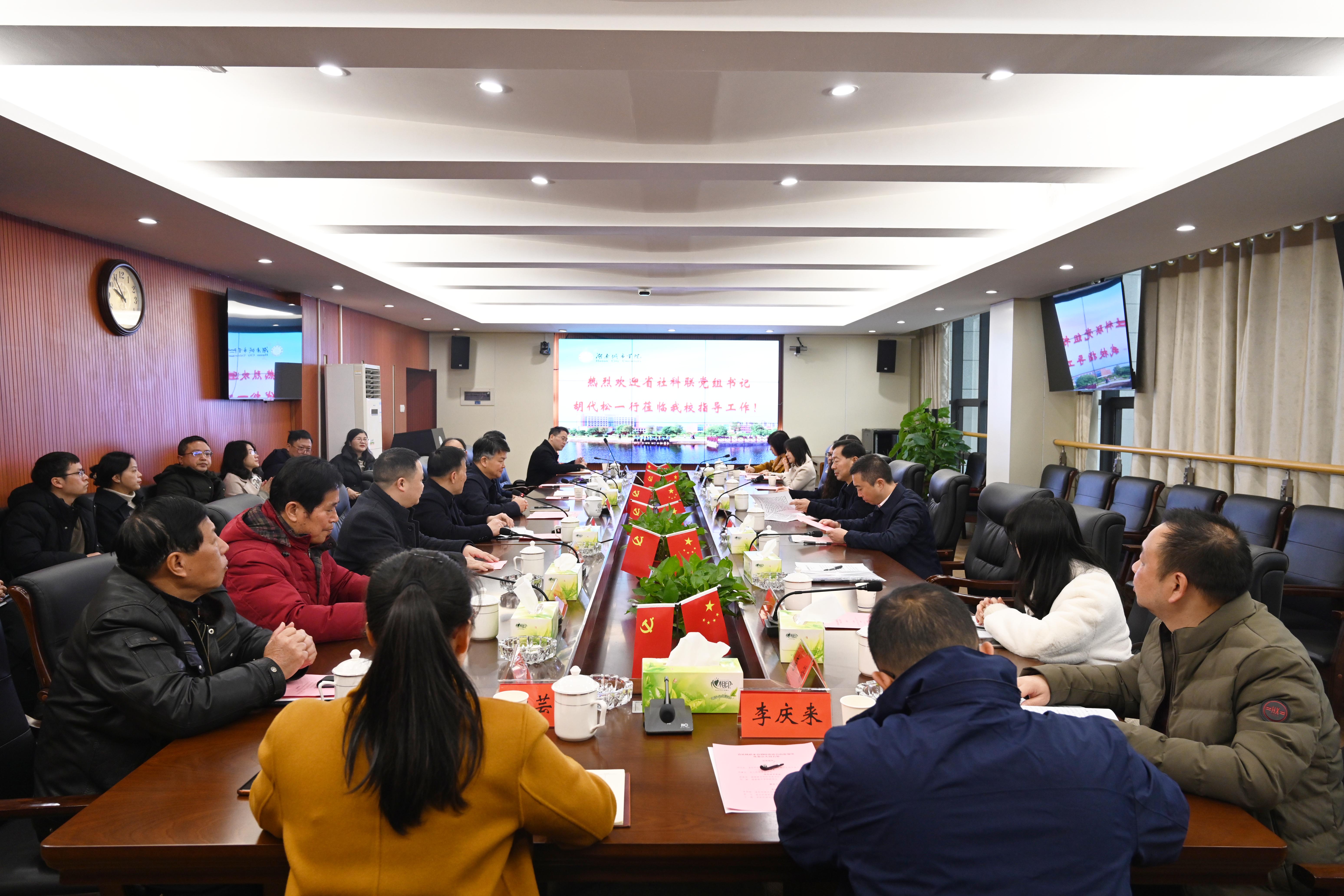 本网讯(通讯员 赵旭)2月17日,湖南省社科联党组书记、副主席(主持日常工作)胡代松一行来我校开展社科工作调研,实地走访我校“安化黑茶非遗传承基地”和“湖湘传统美术研究基地”,并召开专题座谈会。学校党委书记汤放华、副校长何振,益阳市社科联相关领导、益阳市兄弟院校科研部门主要负责人、学校科研处及相关社科类学院的主要负责人参加座谈会。