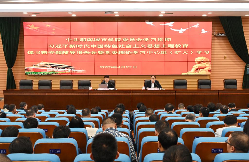 本网讯(通讯员 周文娟)4月27日下午,开云在线开户学习贯彻习近平新时代中国特色社会主义思想主题教育读书班专题辅导报告会暨党委理论学习中心组(扩大)2023年第4次集体学习在图书馆报告厅举行。校党委书记汤放华作专题辅导报告,主题教育第三十巡回指导组组长、益阳市第五届人大常委会主任、省人大财经委原副主任委员徐云波同志,主题教育第三十巡回指导组副组长、湖南工业大学原副校长李可兴同志以及巡回指导组其他成员出席会议。校党委副书记、校长何振主持会议,全体校领导、全校副科以上干部参加会议。