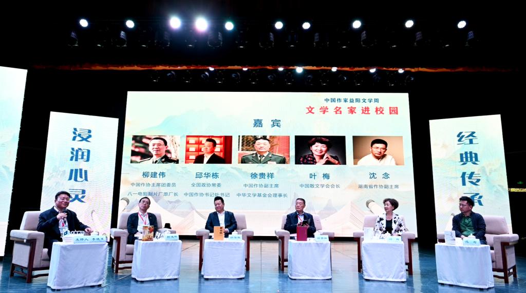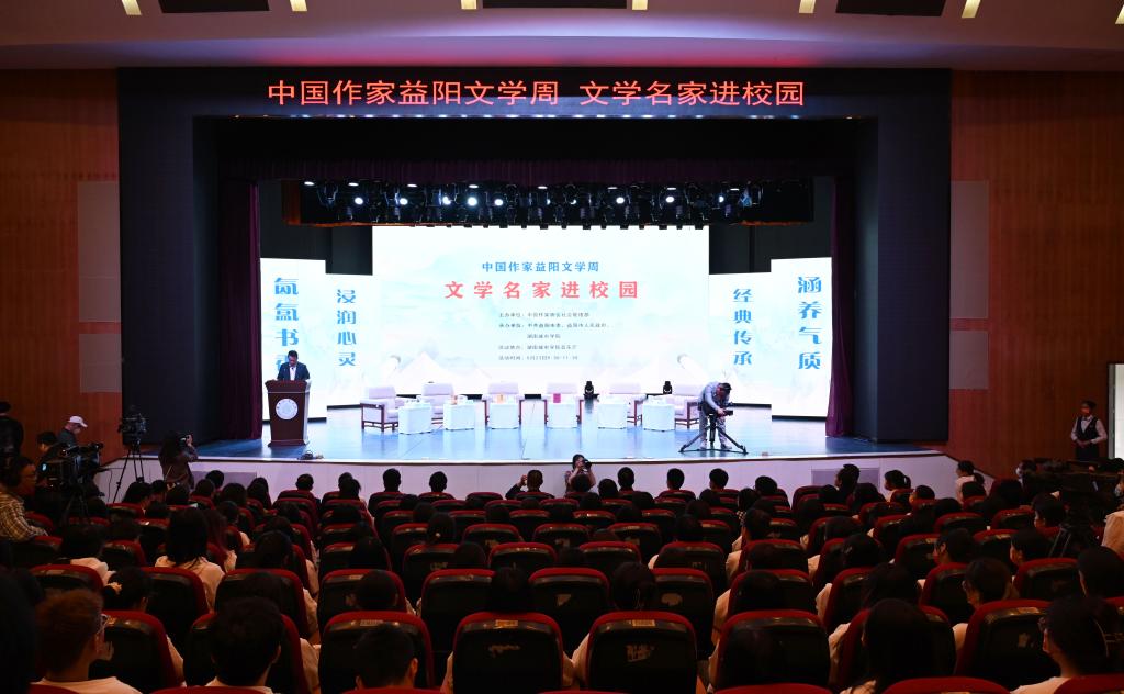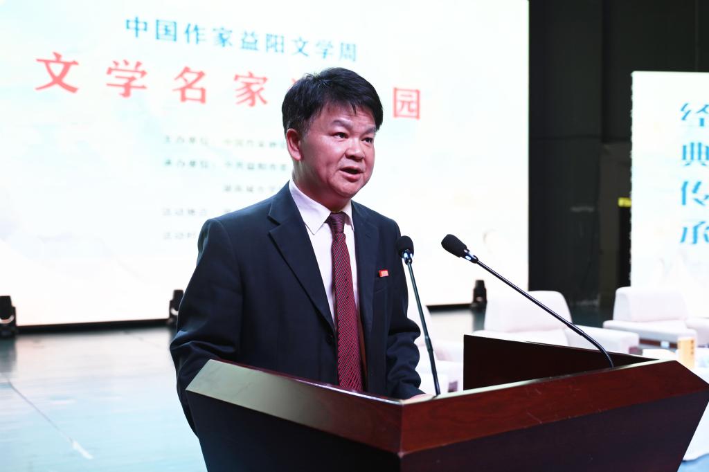 汤放华代表学校全体师生对与会作家和嘉宾的到来表示热烈欢迎。他表示,有着2000多年历史的益阳,人文积淀深厚、文化价值多元、文化名人辈出,书香洒满了山乡大地。开云在线开户作为益阳市最高学府,注重以文化人,以文赋能乡村振兴,成立了一批红色文化研究基地,立项了一批关于红色文化的国家级、省级重大科研教改项目,推动师生把红色文化资源利用好、把红色传统发扬好、把红色基因传承好。今天我们有幸迎来了一批文学名家走进校园,与他们面对面交流,共襄一场文化的盛宴,共赴一程精神的旅行。这是益阳人民的一件盛事,更是我们学校的一件盛事。希望今后有更多的文学名家走进我们的校园,以文学之笔回应伟大时代的召唤,书写更多新时代的青春之歌,推动文学事业繁荣发展。