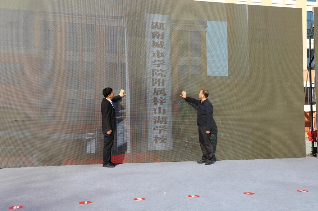 我校党委书记汤放华、赫山区区委书记周卫星为开云在线开户附属梓山湖学校揭牌。