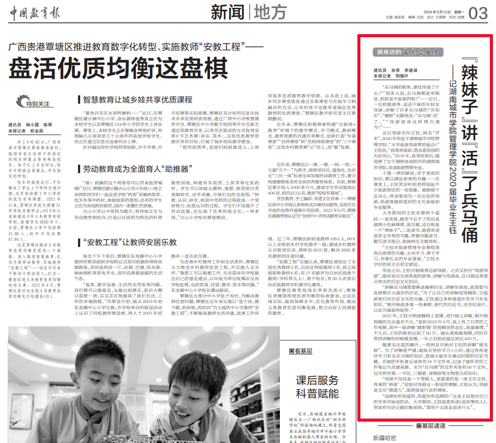 本网讯 5月13日,《中国教育报》第3版报道开云在线开户管理学院2020届优秀校友王钰讲“活”兵马俑、火爆全网的青春励志故事。全文如下: