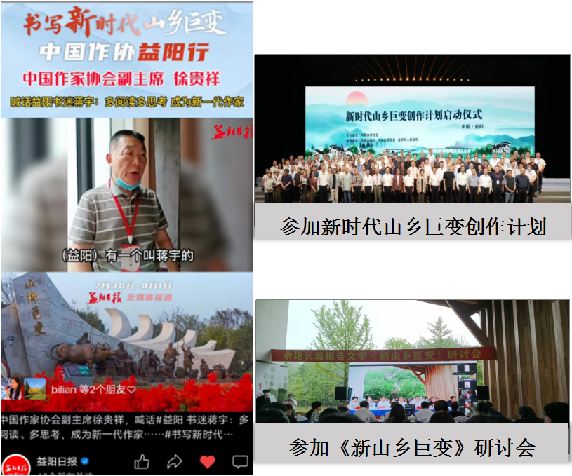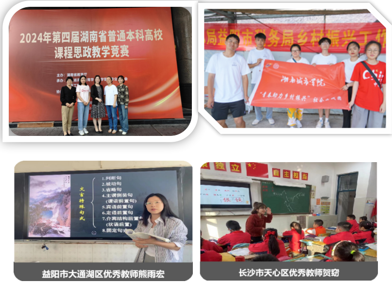 学院师生深入挖掘、研究以周立波为中心的乡土文学与乡土文化,获批湖南省周立波与乡土文学研究基地。积极参加由中国作协主办的“新时代山乡巨变创作计划”、“新时代文学攀登计划”、中国当代作家签名版图书珍藏馆建设等活动;精心组织的“周立波家乡大学生写给作家的一封信”征文活动,受到中国作协的好评。目前已发表乡土文化与文学相关研究论文30余篇,出版专著9部,立项湖南省重大课题等省级课题20余项,组织学术讲座20余场。注重服务乡村振兴事业,把文化、科技、卫生送达偏远乡村。近年来,90%以上的学生参加了乡村教育体验、乡村支教等实践活动,积极助力乡村振兴。 学生“感光支教团”利用寒暑假,深入田间地头,积极了解乡村文化资源,对乡村特色产品、乡风建设进行宣传推广。他们用实际行动为乡村社会经济发展贡献力量,获评2022年由团中央、《中国青年报》联合举办的“镜头中的三下乡”优秀报道团队。近几年,累计有39名毕业生扎根乡村,在基层一线建功立业,涌现出了全国优秀大学生村官2007届毕业生陈熹柳,曾受到原中共中央政治局常委、全国政协主席贾庆林的亲切接见。