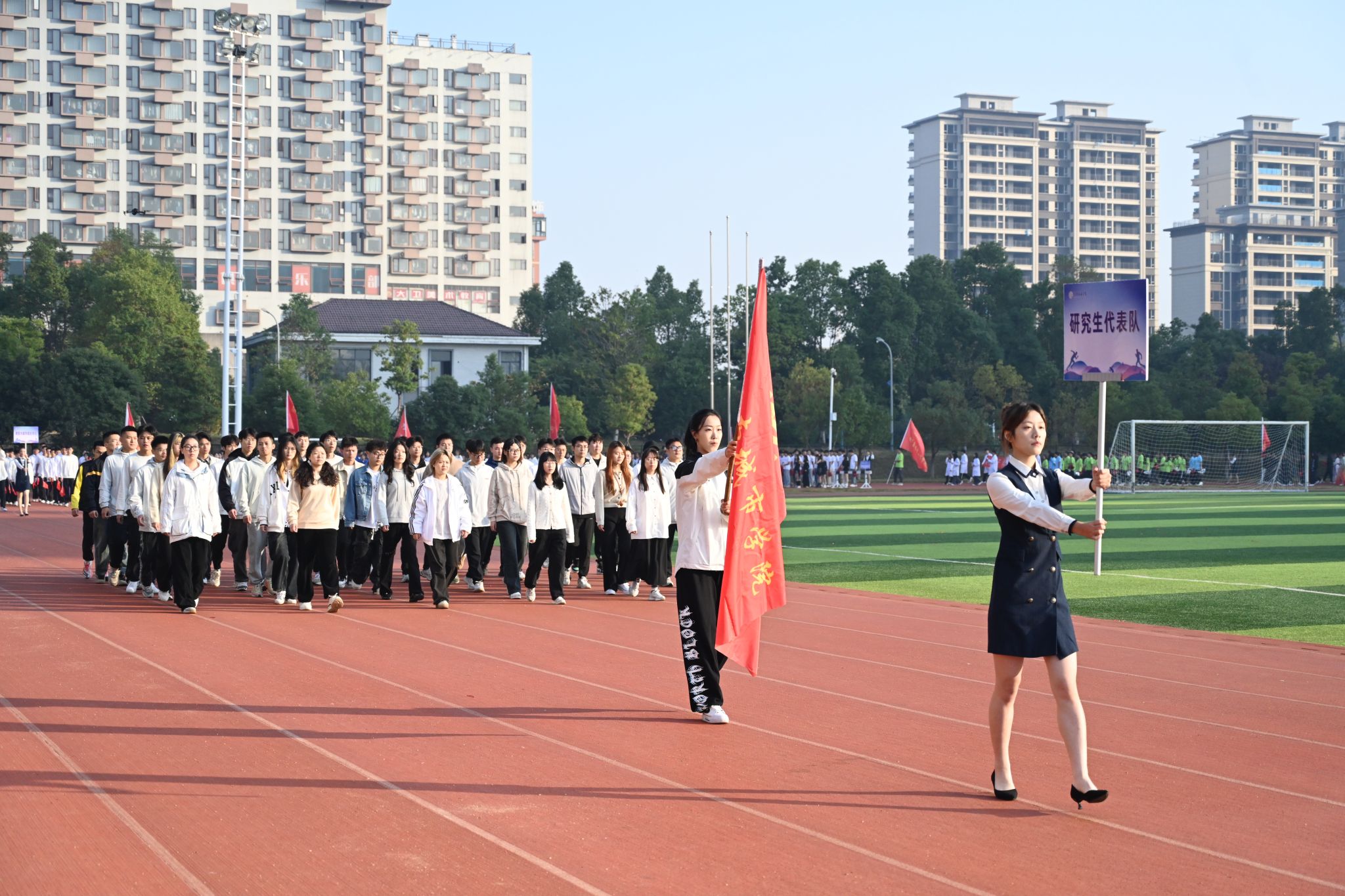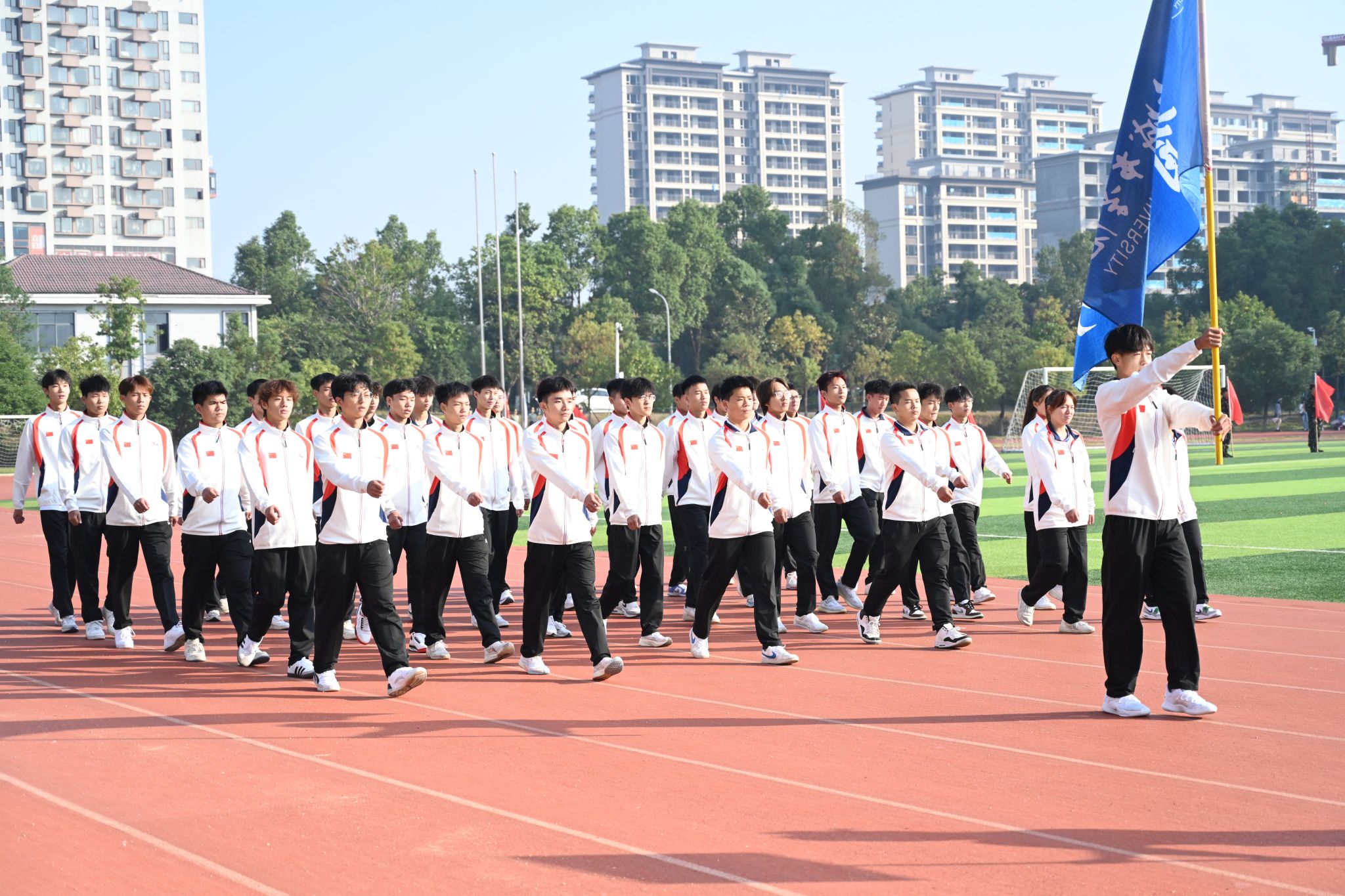 伴随着激昂的进行曲,英姿飒爽的护旗手高举国旗、校旗率先入场,校训方阵、教导队方阵、裁判员方阵、志愿者方阵、各二级学院运动员代表方阵紧随其后,依次入场,他们精神抖擞、斗志高昂,迈着整齐的步伐,阔步走向主席台,豪迈自信的声音响彻在整个田径场的上空。