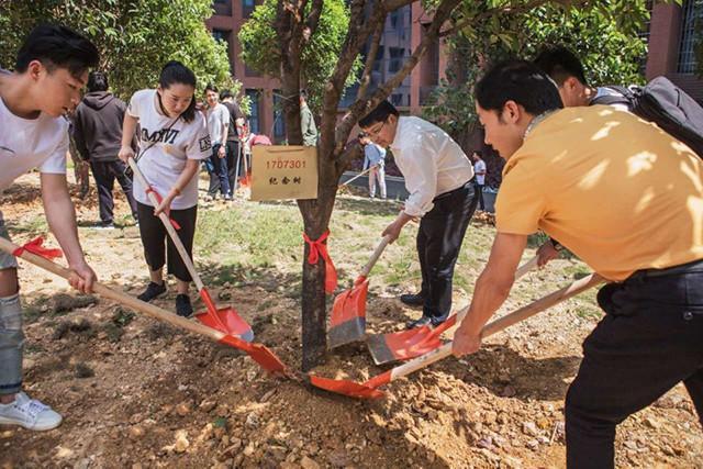 开云在线开户党委书记罗成翼(左三)与毕业生一同栽树。