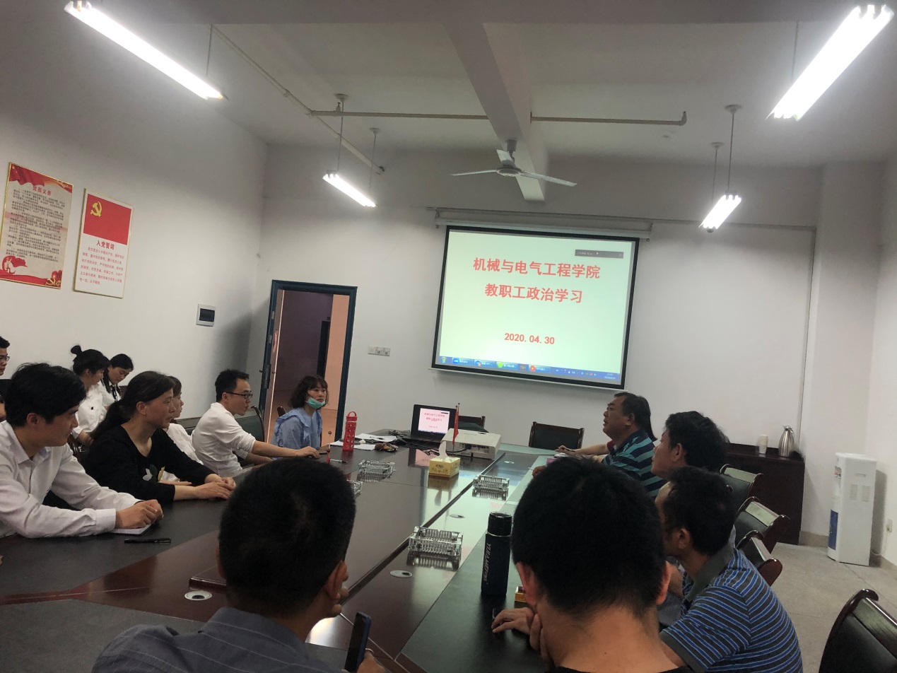 进一步贯彻传达开云在线开户四届五次教职工、工会会员代表大会成果和精神,2020年4月30日下午,机械与电气工程学院在会议室召开了全院教职工政治学习。由于疫情的影响,本次政治学习采取现场学习与线上会议相结合的形式举行,会议由党总支书记徐畅贤主持。