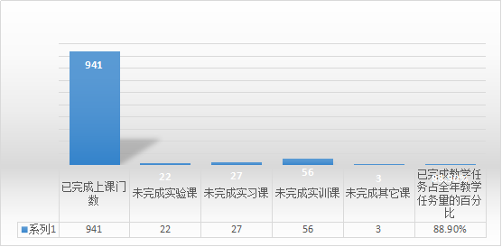 2020年上学期,全校完成网上教学课程 941 门,占教学总任务的88.9 %。