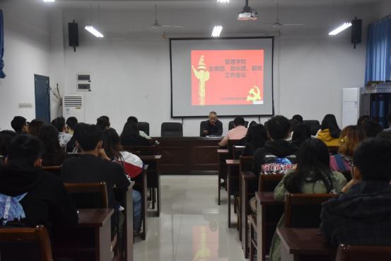 (管理学院通讯员邓瑞琨)为了提高管理学院学生会干部综合素质,提高学生干部对部门事务处理效率,10月24日下午16:00管理学院于管理楼工会大会议室召开主席团部长团副班工作会议。本次会议到场嘉宾有学工办主任王方俊老师,辅导员李姗老师,辅导员王卡妮老师,辅导员熊鹏飞老师,辅导员张力老师。本次会议由管理学院党委副书记王润华主持。