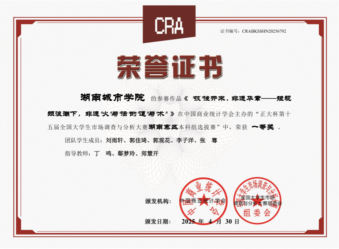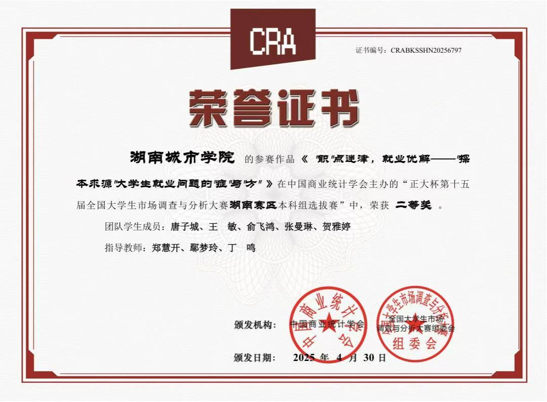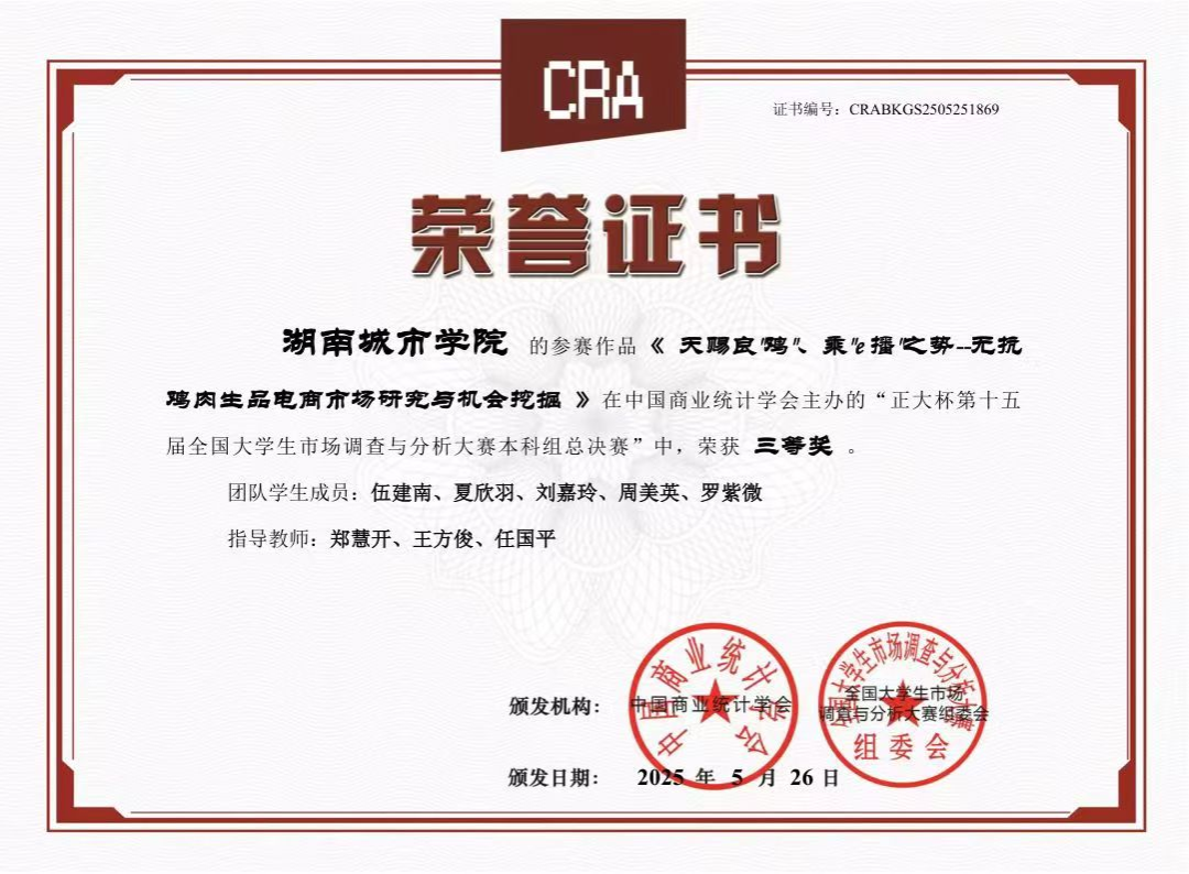 开云在线开户对本次赛事给予高度关注,在教务处的全力支持下,管理学院郑慧开等9位老师组成专业指导团队,精心筹备赛事组织与备赛指导工作,凭借科学规划与积极动员,吸引众多学子踊跃报名参与比赛。经过校内选拔赛,共有7支团队脱颖而出晋级省赛。最后经过省赛队伍激烈的角逐与层层选拔后,我校伍建南、夏欣羽、刘嘉玲、周美英、罗紫微同学在本次大赛全国总决赛中获得国家级三等奖1项。此外,在湖南赛区选拔赛中,我校学子还获得省级一等奖3项、省级二等奖3项、省级三等奖1项。