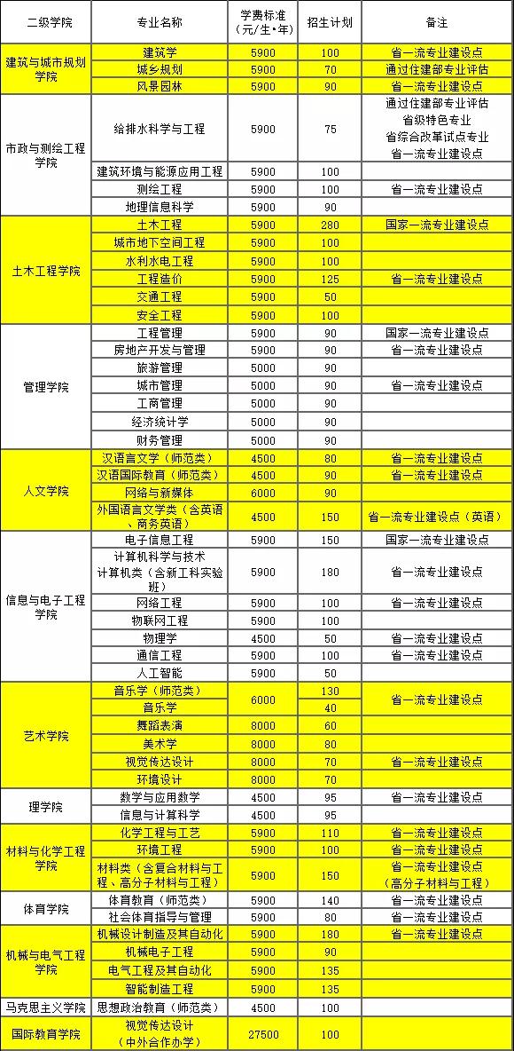 学校设有13个二级学院,55个本科专业,面向30个省、市、自治区招生,现有全日制本科生20000余人。学校城乡规划专业为国家级特色专业和综合改革试点专业;电子信息工程、土木工程、工程管理专业入选国家一流本科专业建设点;化学工程与工艺、社会体育指导与管理等6个专业是省级特色专业和省级重点专业;给排水科学与工程等5个专业是湖南省综合改革试点专业。管理科学与工程、体育学、信息与通信工程、化学工程与技术等6个学科是湖南省“双一流”应用特色学科,风景园林、测绘工程、房地产开发与管理、汉语言文学、音乐学、数学与应用数学、机械设计制造及其自动化等27个专业入选湖南省一流本科专业建设点。