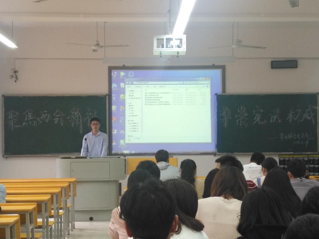 2018年3月29日14:00,为集中对管理学院入党积极分子进行政治学习教育,学生各党支部于管理楼开展了以“聚焦两会精神,尊崇宪法权威”为主题的本学期第一次政治学习。本次政治学习的主讲人为管理学院学生联合党支部大三党员,管理学院大一至大三入党积极分子参与了本次政治学习。