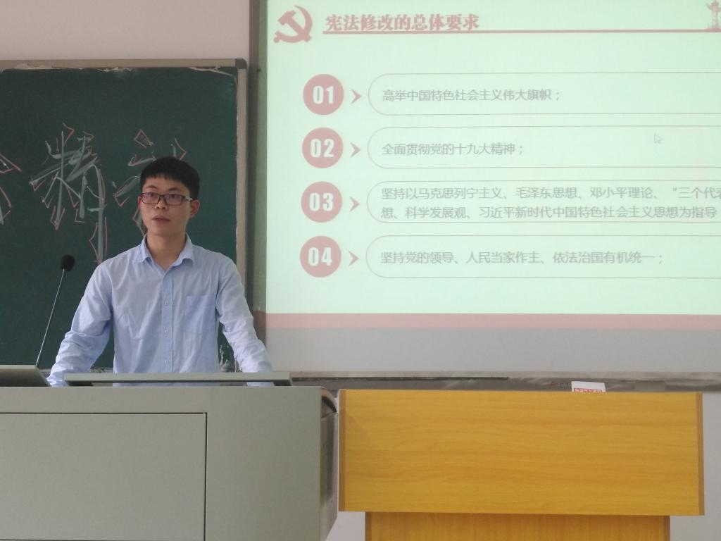 首先,主讲人带领同学们重点学习了《中华人民共和国宪法修正案》,同时向大家介绍了全面依法治国取得的各项成就,使同学们意识到维护宪法权威、捍卫宪法尊严的必要性。紧接着,他向大家介绍了2018年全国两会的基本情况和主要内容,并聚焦到两会精神,倡导大家努力学习优良精神,提高自身思想道德修养。最后,同学们一起回顾了我国过去五年的工作成就,深入学习了社会主义核心价值观。最后,同时带大家了解了有关创建文明城市的部分内容。