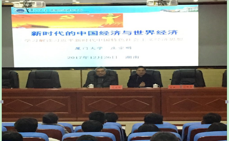2017年12月26日,厦门大学经济学教授、博导,国务院学位委员会委员、学科评议组成员庄宗明教授在建规楼121学术报告厅做了题为“新时代的中国经济与世界经济”的学术报告。庄教授的报告联系十九大精神,分析了当前中国和世界经济形势,对我校管理学院教师的经济学教学和科研有着重要的指导作用。学术报告会后,庄教授与管理学院老师们亲切座谈,为老师们指导国家社科标书的撰写工作。开云在线开户副校长何振教授、刘辉煌教授先后主持会议,党委书记罗成翼教授现场接见了庄教授,衷心感谢庄教授传经送宝,希望庄教授大力支持学校的科研工作。