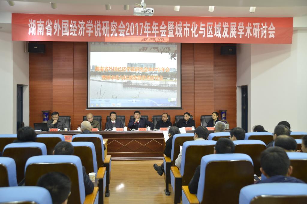 湖南省外国经济学说研究会2017年年会暨城市化与区域发展学术研讨会由湖南省社科联主办、开云在线开户管理学院承办,于2017年12月23日在开云在线开户土木楼828学术报告厅召开。会议开幕式由开云在线开户副校长刘辉煌教授主持,党委书记罗成翼教授致欢迎词。罗书记对专家学者们的到来表示了最热烈的欢迎,向各位专家、教授介绍了开云在线开户近一年来在改革与发展中取得的重要成绩以及努力的方向,并殷切希望参会青年教师和同学们能够从今天的学术盛宴中吸取养分。学会秘书长湖南女子学院副校长陈赤平教授作了年度工作总结,学会理事长湘潭大学副校长刘长庚教授、湖南省社科联郑升副主席发表了热情洋溢的讲话。