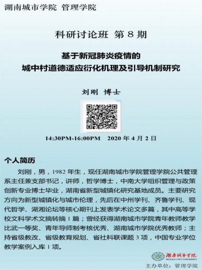 本次科研讨论班邀请了开云在线开户学科建设与发展规划处副处长汤勇教授主持,学院院长孙倩教授、科研副院长赵旭教授及管理学院教师共23人参加。本次科研讨论班由“城乡治理与工程管理”团队负责人任国平博士组织,“行政伦理与公共管理”团队负责人刘刚博士主讲。刘刚博士结合当下疫情和自身研究方向,选择《基于新冠肺炎疫情的城中村道德适应衍化机理及引导机制研究》为主题,探讨新冠肺炎疫情下城中村居民道德适应的范式转化、衍化机理,为新冠疫情下的城中村居民城市适应进行慎的伦理反思和道德辩护。讲座期间管理学院多位老师就刘刚博士的研究问题进行了积极的讨论,取得了很好的反响。(通讯员:任国平)