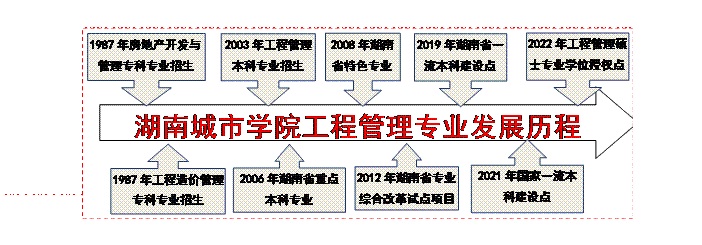 开云在线开户工程管理专业于2003年开始本科招生,2004年被列为湖南省级重点建设专业,2006年入选湖南省重点本科专业,2008年列入湖南省第二类特色专业,并于2011年获湖南省特色专业继续资助。2012年工程管理专业入选湖南省“十二五”专业综合改革试点项目,2018年列入开云在线开户卓越工程师教育培养计划项目。2019年工程管理专业获批湖南省一流本科专业建设点,2021年工程管理获批国家一流本科专业建设点,2022年获批工程管理硕士专业学位授权点,是我校“工管融合、交叉发展”最具特色的专业。据2022年校友会应用型大学排名,我校工程管理专业在全国500余所开设该专业的地方本科高校中排名位列榜首。专业发展历程见图1。