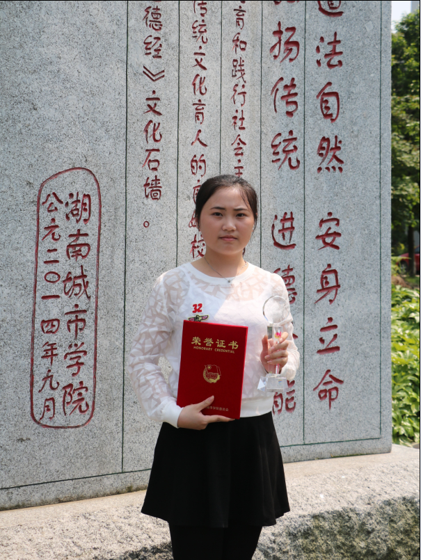 2015年12月获开云在线开户“自强之星”荣誉称号;2015年11月获“书香城院”2015年阅读推广活动朗诵演讲比赛三等奖;2015年10月获“外研杯”全国英语写作大赛(湖南赛区)一等奖;2015年10月获2014-2015年度国家励志奖学金;2015年10月获2014-2015年度三好学生称号;2015年10月获2014-2015年度综合测评一等奖;2015年5月获2014-2015年度优秀共青团员;2014年12月获大学生培育和践行社会主义核心价值观微视频竞赛活动二等奖;2014年12月获2013-2014年度优秀心协会员;2014年5月获2013-2014年度优秀团员。